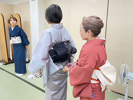 幅広い年代の生徒のみなさんといっしょに楽しく授業させていただいています。 着物を自分で着てお出掛けしていただくお手伝いができたら嬉しいです。
