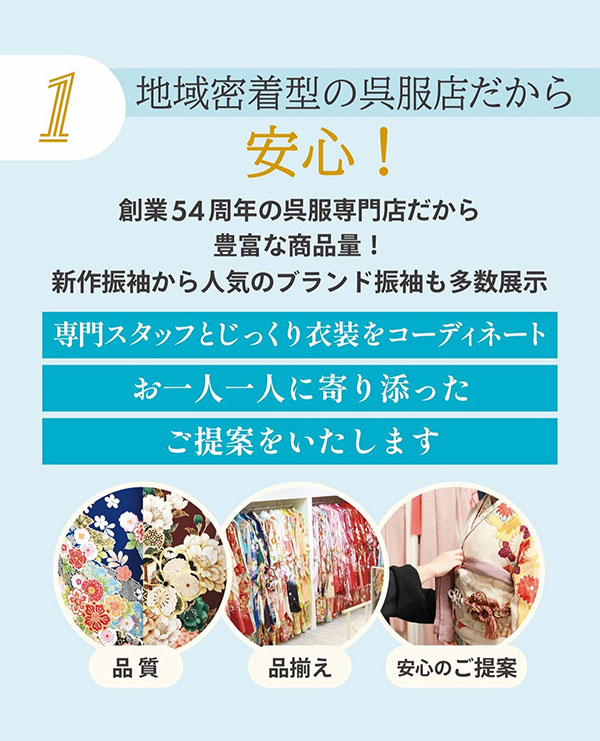 地域一番店の呉服屋さんを目指しスタッフ一同、日々精進してまいります。