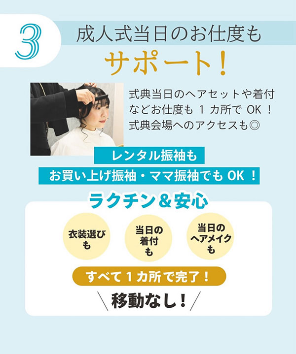 はたちのつどい(成人式)当日のお支度も全て所沢店の中で行えるので、色々と回らなくて済むので楽々ですよ♪