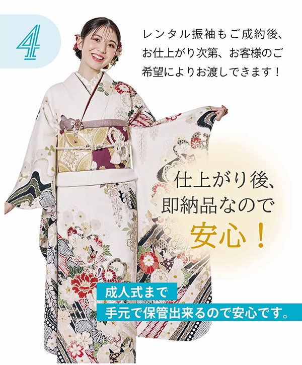 振袖のレンタルは、お仕立て上がりの振袖からお嬢様に近いサイズに仕立てるセミオーダーのレンタル振袖までご希望に合わせて選べます。