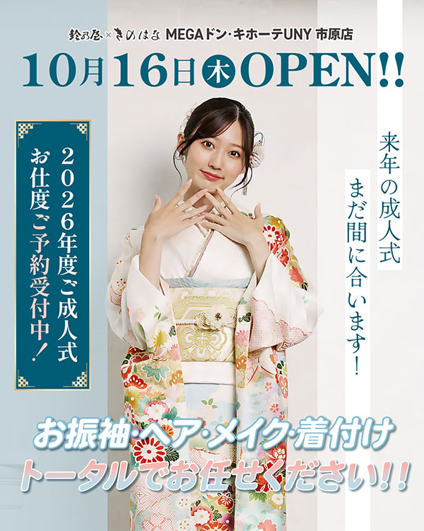 鈴乃屋×きのはな MEGAドン・キホーテUNY市原店は、振袖だけではなく、小物類に至るまで、どこにも負けない品揃えでお待ちしております。