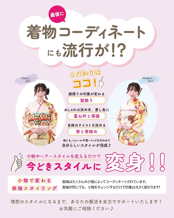 プロの専門スタッフが、お客様のお持ちになった振袖を使用し、最新トレンドとお嬢様のお好みに合わせてコーディネートをご提案致します!お気軽にお問い合わせください!