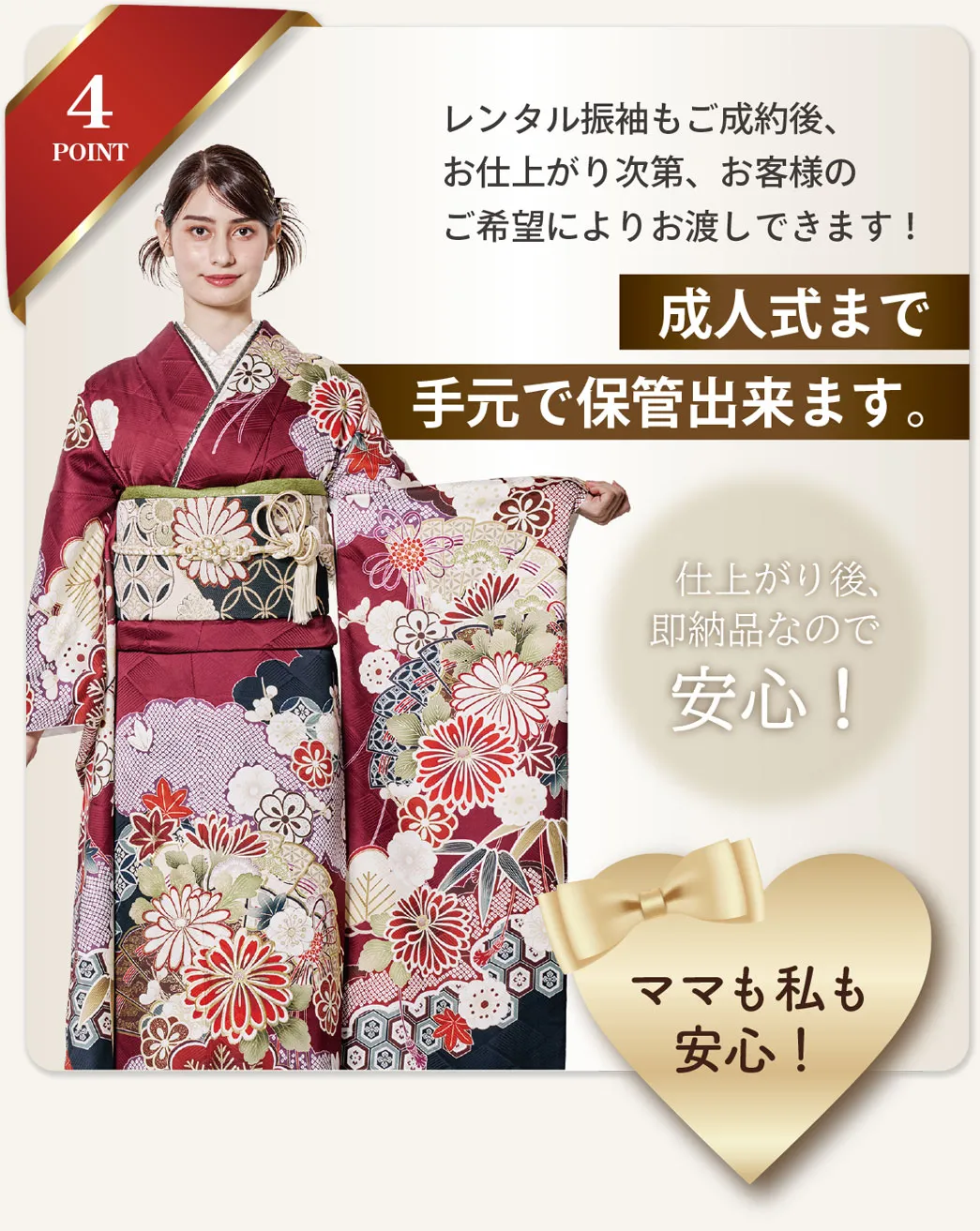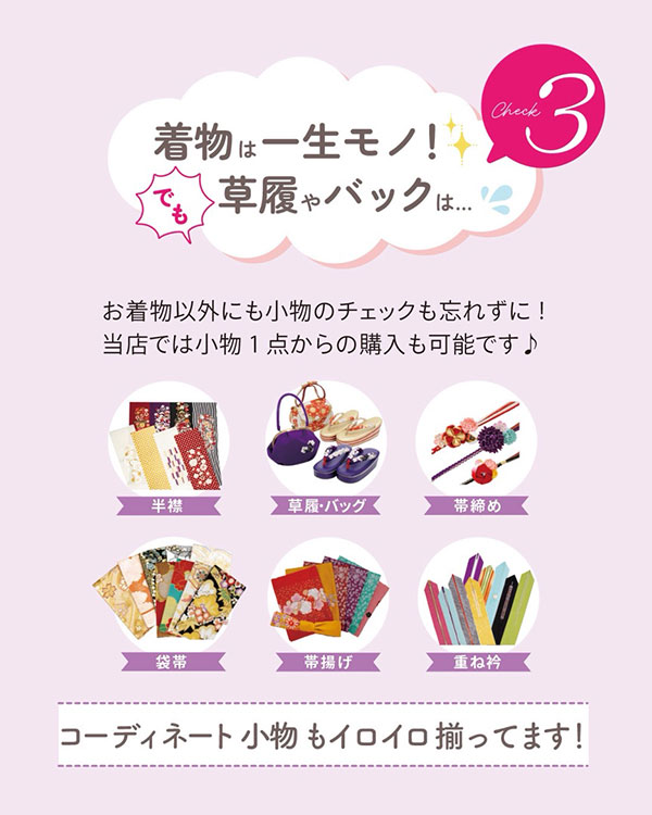 「振袖や小物など少なかったり、コーディネートもセットになっていて選べない」という声をよく聞きますが、当店ではそのようなことは一切ございません。